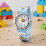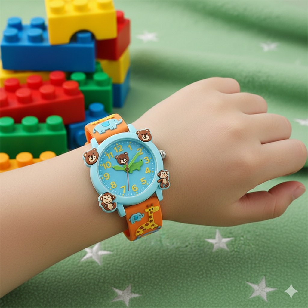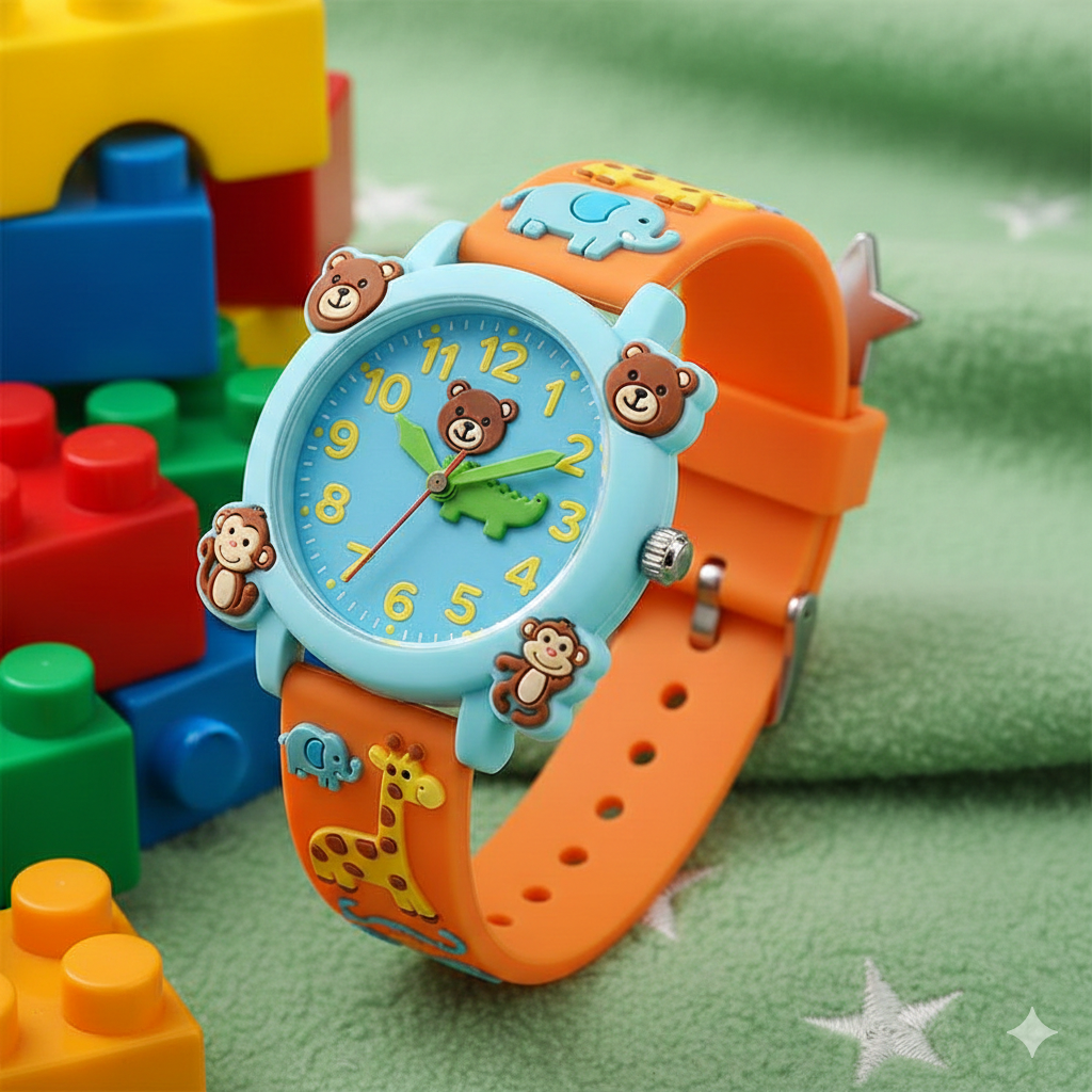 ساعة ذات طابع تعليمي، تتميز بميناء أبيض وأرقام واضحة جداً بألوان مختلفة (كل رقم بلون) لمساعدة الطفل على تعلم قراءة الوقت بسهولة. عادة ما تأتي بسوار قماشي متين.